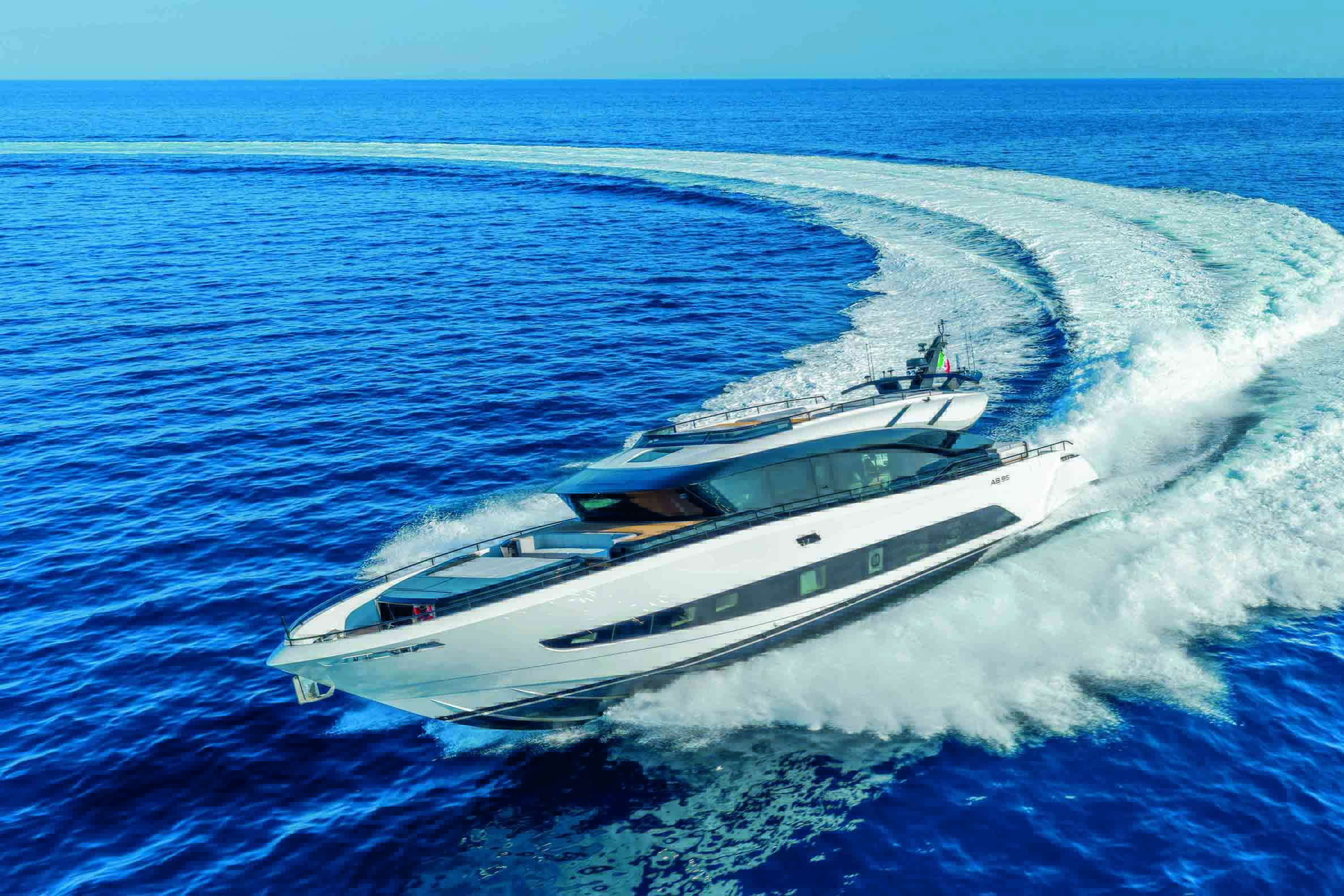 Imaginez une unité de près de 30 mètres filant à 50 nœuds devant vos yeux ébahis ! C’est la promesse faite par AB Yachts, membre de Next Yacht Group, avec le lancement de l’AB 95. Le constructeur italien, depuis sa création en 1992, s’est fait une spécialité des unités à caractère sportif, mais sans jamais y sacrifier élégance et confort. Ce résultat est le fruit d’innovations techniques et technologiques, que ce soit dans la construction avec, par exemple, un usage intensif de la fibre de carbone et une chasse au poids drastique pour les aménagements, ou que ce soit dans la propulsion en associant trois moteurs diesels MAN, développant 2 000 ch chacun, à des jets MJP (deux orientables et un booster). La vitesse maximale est donc annoncée à 50 nœuds – quand le 110S « culmine » à 48 nœuds pour la même motorisation – avec une autonomie de 440 milles en vitesse de croisière (45 nœuds !). Avantages supplémentaires apportés par la propulsion par jets : manœuvrabilité accrue dans les ports, nuisances sonores diminuées et quasi-absence de vibrations.