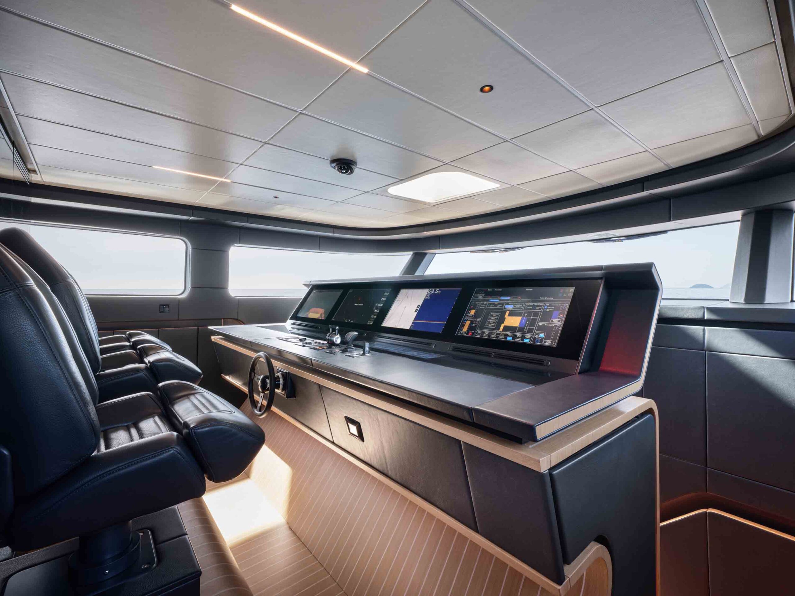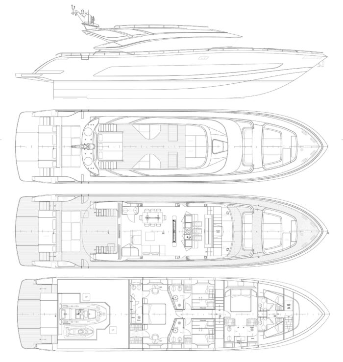 En pénétrant dans la partie couverte du pont principal, on est saisi par la notion de volume très fortement appuyée par les longues baies latérales. Un salon avec fauteuils et banquettes fait face à une table qui s’adapte au nombre de convives que l’on imagine jusqu’à huit. Dans le fond, un comptoir laqué de noir, et dissimulant un écran TV, précède une cloison traitée de façon identique ; entre les deux, la cuisine permet au chef de travailler à vue. En continuant vers l’étrave, la timonerie occupe une position centrale et possède un équipement impressionnant, dont une partie issue de technologies militaires pour maîtriser le tempérament fougueux de l’AB 95. Enfin, toujours pour respecter la symétrie, deux escaliers au design similaire à ceux de la poupe sont situés en avant de la timonerie et se rejoignent au centre pour desservir les quatre cabines du niveau inférieur. Ce nombre résulte du positionnement de la cuisine au pont principal, ce qui libère du volume en bas. La suite des armateurs occupe toute la largeur au centre de l’AB 95, avec lit central, deux bureaux – symétrie, quand tu nous tiens –, dressing et belle salle d’eau de blanc vêtue. Les matériaux sont raffinés, avec de grandes surfaces réfléchissantes pour augmenter la sensation d’espace, et le jeu de lumière électrique recherché est conçu comme un élément de décor. Au centre, deux cabines avec lits simples (coulissants pour former un double) et pullman, bien que plus modestes, bénéficient des mêmes soins dans leur habillage et de deux salles d’eau. Enfin, la cabine VIP n’a pas grand-chose à envier à la master, si ce n’est des dimensions un peu plus contraintes. À la proue et accessible par le pont avant, le quartier équipage comprend deux cabines simples et deux cabinets de toilette.