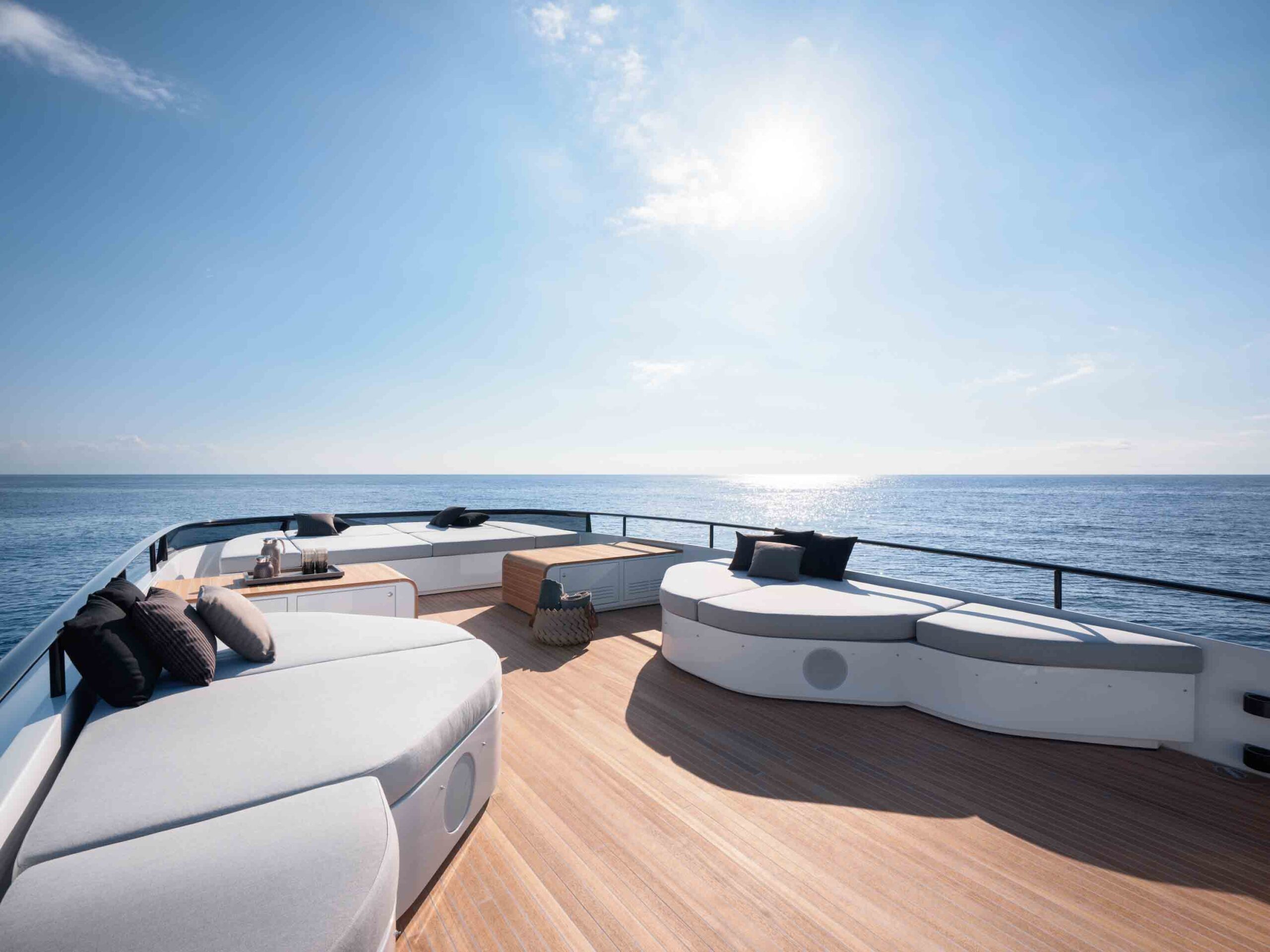 S’il se fait discret, il ne faudrait pas oublier le sundeck. On découvre un vaste espace dédié à la détente avec un solarium à chaque extrémité et deux banquettes au centre. Comme partout sur le bateau, on retrouve une utilisation généreuse du teck, sur les planchers bien sûr, mais aussi sur certains meubles avec des courbes des plus réussies. Le dépouillement général relève tout à la fois de la volonté de ne pas alourdir la silhouette de l’AB 95, mais aussi, on le suppose, de l’impossibilité d’installer un poste de pilotage non protégé sur une unité qui atteint les 50 nœuds. À vitesse réduite ou au mouillage, cette terrasse ouverte sur la mer devrait rassembler les suffrages et devenir un lieu incontournable à bord. Pour supporter les ardeurs du soleil, une toile d’ombrage s’installe en quelques minutes sur quatre poteaux en carbone. De quoi savourer des instants paisibles après avoir éprouvé l’ivresse de la vitesse.